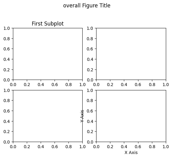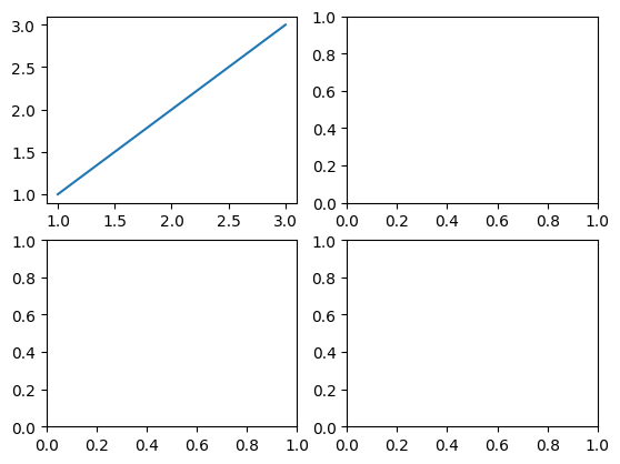 plt.subplots()(推荐)pythonfig, axes = plt.subplots(nrows=2,ncols=2) # 创建2*2的子图网格 axes[0, 0].plot([1, 2, 3], [1, 2, 3]) # 在第一个子图上绘制