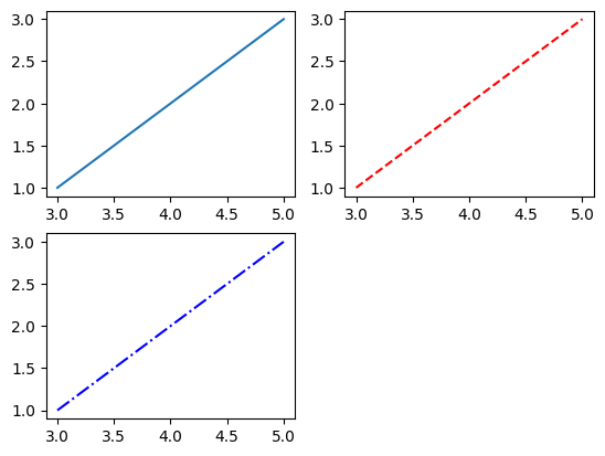 plt.subplot()pythonplt.subplot(2, 2, 1) # 选择2行2列的第一个子图 plt.plot([3,4,5],[1,2,3]) plt.subplot(2, 2, 2) # 选择2行2列的第一个子图 plt.plot([3,4,5],[1,2,3],'r--') plt.subplot(2, 2, 3) # 选择2行2列的第一个子图 plt.plot([3,4,5],[1,2,3],'b-.')