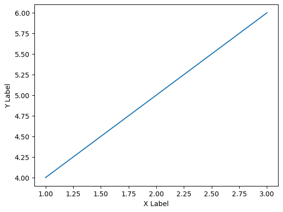 pythonimport matplotlib.pyplot as plt fig, ax = plt.subplots() # 在ax上绘图(等效于plt.plot()) ax.plot([1, 2, 3], [4, 5, 6]) ax.set_xlabel("X Label") # 设置x轴标签 ax.set_ylabel("Y Label") # 设置y轴标签 plt.show()