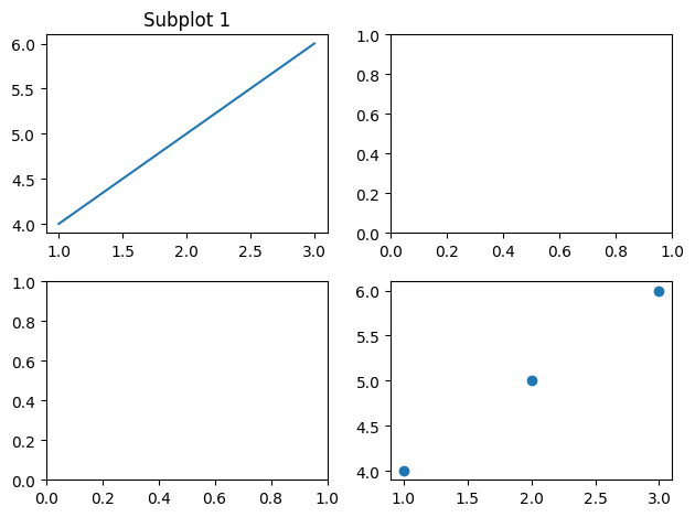 python# 创建2行2列的子图网格(共4个坐标轴) fig, axes = plt.subplots(nrows=2, ncols=2) # 在第一个子图(左上角)绘图 axes[0, 0].plot([1, 2, 3], [4, 5, 6]) axes[0, 0].set_title("Subplot 1") # 在第四个子图(右下角)绘图 axes[1, 1].scatter([1, 2, 3], [4, 5, 6]) plt.tight_layout() # 自动调整子图间距 plt.show()