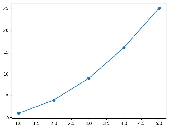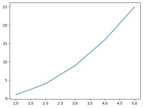 python# 单线统计图 import matplotlib.pyplot as plt plt.plot([1,2,3,4,5],[1,4,9,16,25])