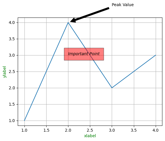 ax.annotate('Peak Value', xy=(2, 4), xytext=(3, 4.5),