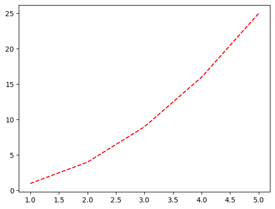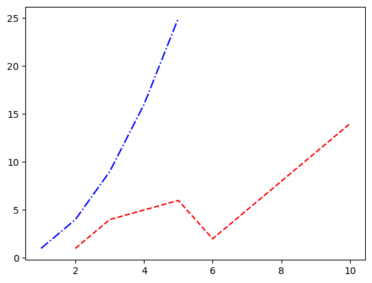 python# 多线统计图 import matplotlib.pyplot as plt plt.plot([1,2,3,4,5],[1,4,9,16,25],'b-.',[2,3,5,6,10],[1,4,6,2,14],'r--')