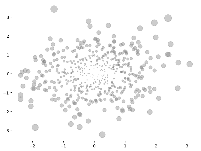 python# 定义均值向量 [0, 0] mu_vec1 = np.array([0, 0]) # 定义协方差矩阵,单位矩阵表示x和y不相关,方差都为1 cov_mat1 = np.array([[1, 0], [0, 1]]) # 生成500个来自二维正态分布的样本点 X = np.random.multivariate_normal(mu_vec1, cov_mat1, 500) fig,ax = plt.subplots(figsize=(8,6)) # 计算每个点的x²和y²值 R = X**2 # 计算每个点到原点的距离平方和(x² + y²) R_sum = R.sum(axis=1) ax.scatter(X[:,0], X[:,1], color='grey', marker='o', s=20*R_sum, alpha=0.4)