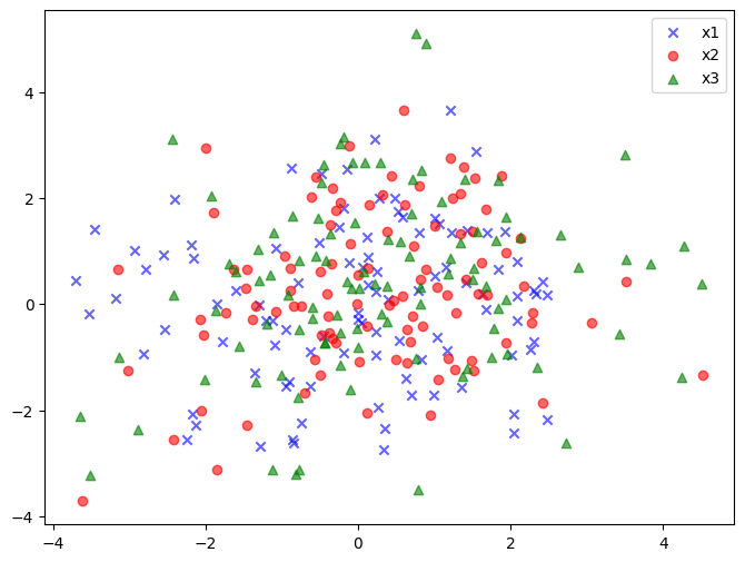 python# 定义第一个分布的均值向量 [0, 0] mu_vec1 = np.array([0,0]) # 定义第一个分布的协方差矩阵,是一个2x2的单位矩阵乘以2 # 这意味着两个维度都是方差为2,且彼此不相关 cov_mat1 = np.array([[2,0],[0,2]]) # 生成100个来自第一个多元正态分布的样本点 x1_samples = np.random.multivariate_normal(mu_vec1, cov_mat1, 100) # 生成100个来自第二个多元正态分布的样本点,均值比第一个分布大0.2(两个维度都+0.2), 协方差矩阵的对角线元素(方差)也增加0.2 x2_samples = np.random.multivariate_normal(mu_vec1+0.2, cov_mat1+0.2, 100) # 生成100个来自第三个多元正态分布的样本点,均值比第一个分布大0.4(两个维度都+0.4), 协方差矩阵的对角线元素(方差)也增加0.4 x3_samples = np.random.multivariate_normal(mu_vec1+0.4, cov_mat1+0.4, 100) fig, ax = plt.subplots(figsize=(8,6)) ax.scatter(x1_samples[:,0], x1_samples[:,1], marker='x',color='blue', alpha=0.6,label='x1') ax.scatter(x2_samples[:,0], x2_samples[:,1], marker='o',color='red', alpha=0.6,label='x2') ax.scatter(x3_samples[:,0], x3_samples[:,1], marker='^',color='green', alpha=0.6,label='x3') ax.legend(loc='best') plt.show()