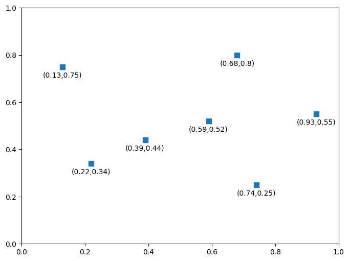 pythonx_coords = [0.13, 0.22, 0.39, 0.59, 0.68, 0.74, 0.93] y_coords = [0.75, 0.34, 0.44, 0.52, 0.80, 0.25, 0.55] fig,ax = plt.subplots(figsize=(8,6)) ax.scatter(x_coords,y_coords,marker='s',s=50) ax.set(xlim=(0,1), ylim=(0,1)) for x,y in zip(x_coords,y_coords): plt.annotate('(%s,%s)'%(x,y), xy=(x,y), # 数据坐标 textcoords='offset points', # 指定文本位置(xytext)的坐标系类型,当前为相对于 xy 的像素偏移 xytext=(0,-15), # 文本位置:向下偏移15像素 ha='center') # 水平对齐方式