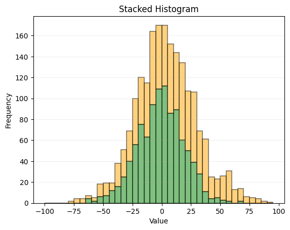 pythondata1 = np.random.normal(0, 20, 1000) data2 = np.random.normal(10, 30, 1000) bins = np.arange(-100, 100, 5) fig, ax = plt.subplots() ax.hist([data1, data2], bins=bins, alpha=0.7, color=['green', 'orange'], edgecolor='black', linewidth=1.2, stacked=True) ax.set_xlabel('Value') ax.set_ylabel('Frequency') ax.set_title('Stacked Histogram') ax.grid(axis='y', alpha=0.75)